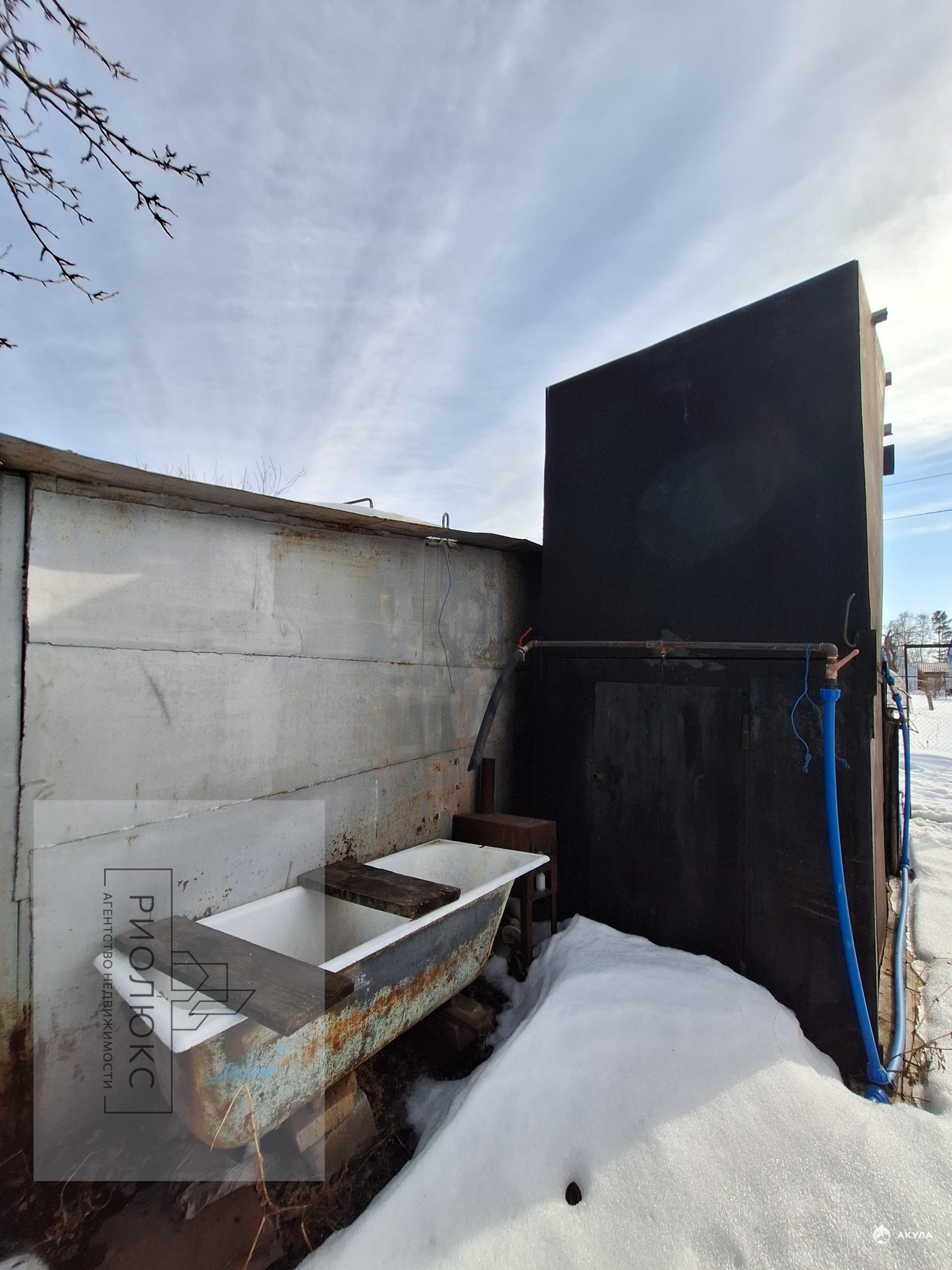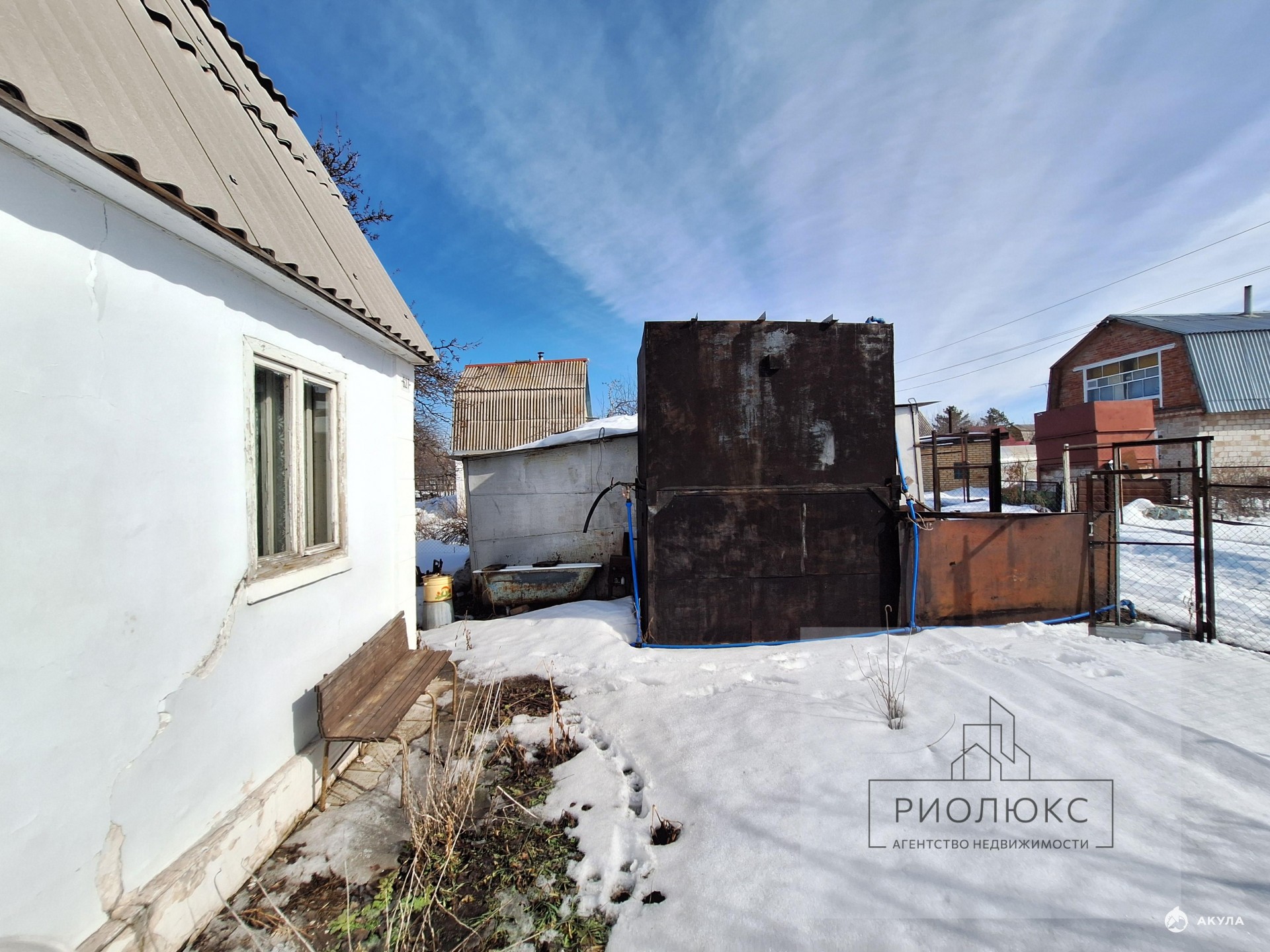 На территории расположен летний душ, 2 теплицы 3х6 м, металлический гараж для автомобиля, металлический бак на 6 м3 для воды, под которым расположен хозблок.