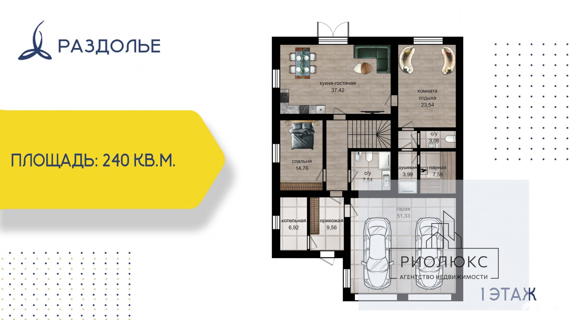 • 1-й этаж: Просторная кухня-гостиная 37 кв.м., 2 спальни, прихожая, котельная, 2 санузла, баня и гараж!