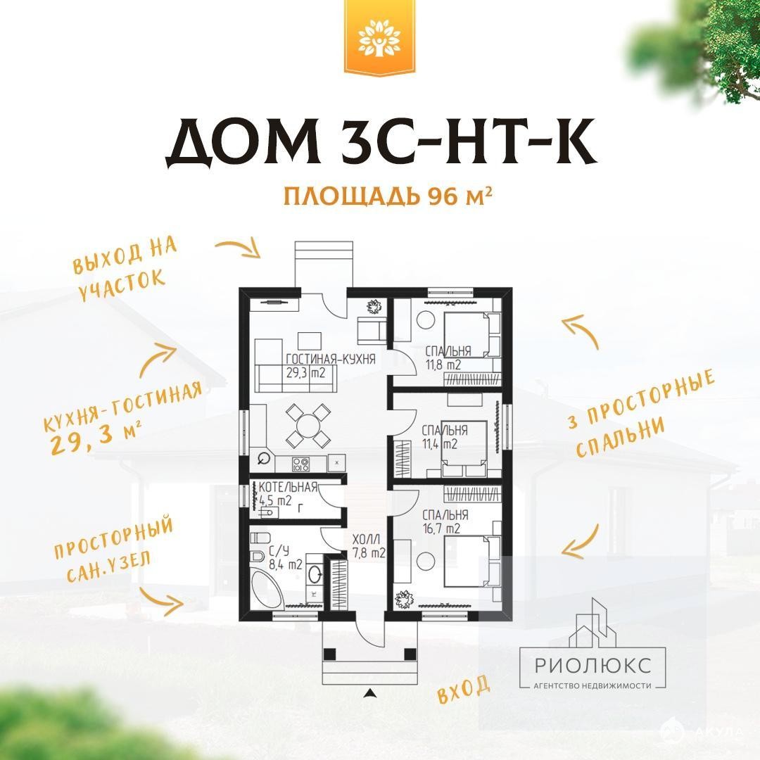 Площадь дома — 96 м² Планировка: — 3 просторных комнаты (11, 8 м²; 11, 4 м²; 16, 7 м²) — большая кухня-гостиная, (29, 3 м²) с выходом на задний двор; — большой сан. узел площадью 8, 4 м²; — все коммуникации уже подведены. Обновленный вариант популярного типа дома, который отлично зарекомендовал себя в посёлках Светлый и Грин Парк. Металлический сайдинг ЭЛЬБРУС — это совершенно новый вид фасадных покрытий. Преимущество стальной имитации бруса очевидна. Ламинация окон в цвет отделки придаёт дому законченный вид. Итог: это продуманный и надёжный дом, представленный в обновленном виде, который точно привлечет ваше внимание и внимание проходящих мимо людей.