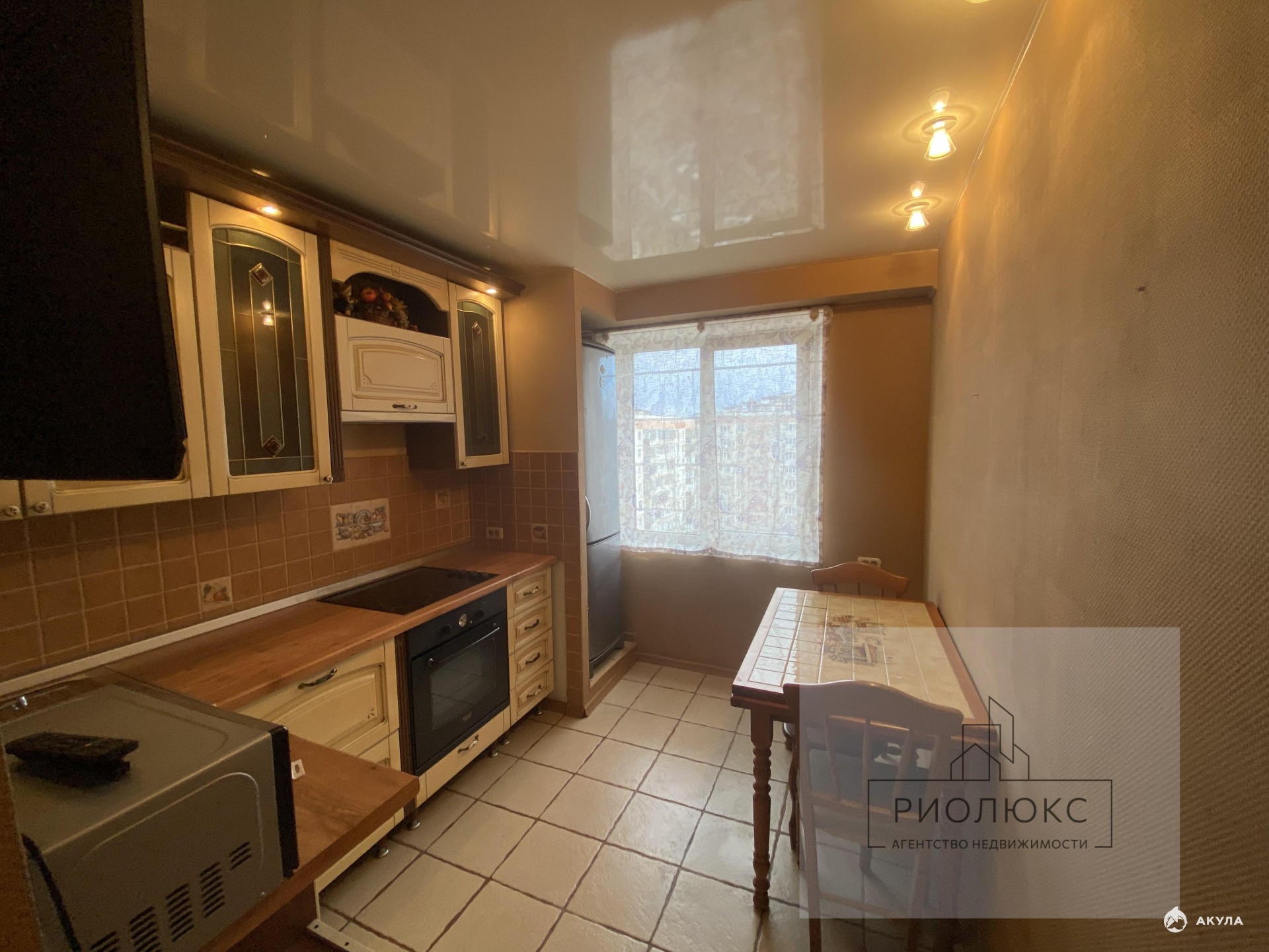 Стены выровнены, потолки - натяжные, на полу в комнатах, коридоре и лоджии - ламинат, на кухне – плитка;